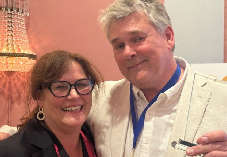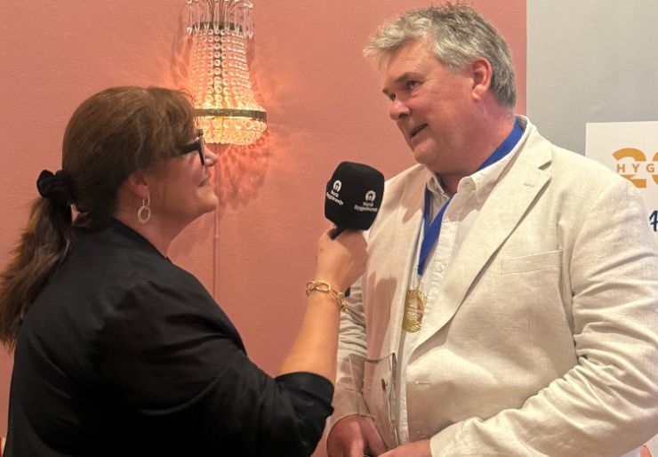 I en aldre av 62 år, beskriver Terje Norheim seg selv som en arbeidshest som trives best på byggeplass, ikke på kontor. Her avbildet med Ellen Øiesvold Palsén, Ansvarlig utgiver NorskByggebransje. Foto: Norsk Byggebransje