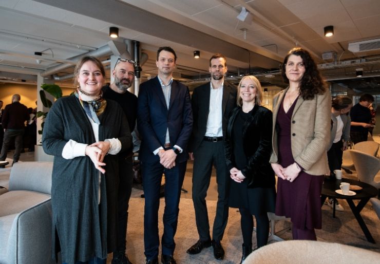 Bidragsyterne (fra venstre): Ellen Hole (byantikvar), Jonas Norsted (Atelier Oslo), Eirik Riddervold (Selmer), Magnus Meland Røed (DNB), Maren Bjerkeng (Aspelin Ramm) og Katharina Bramslev (Grønn byggallianse). Foto: Niklas Hart