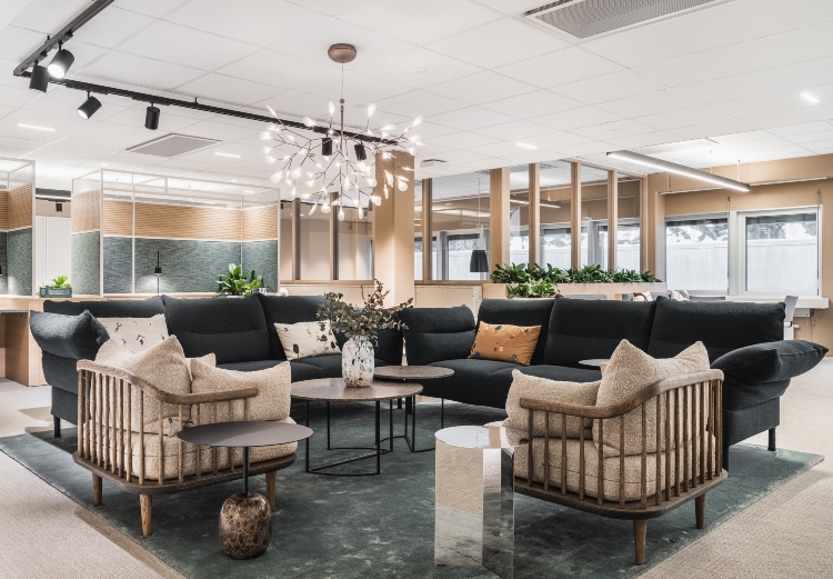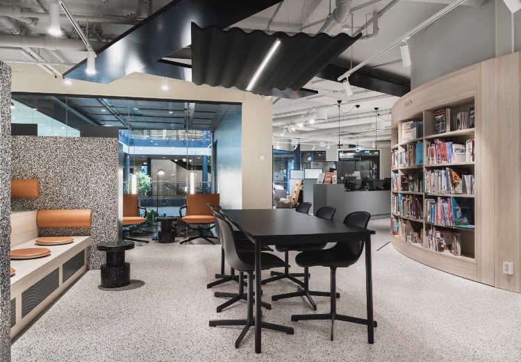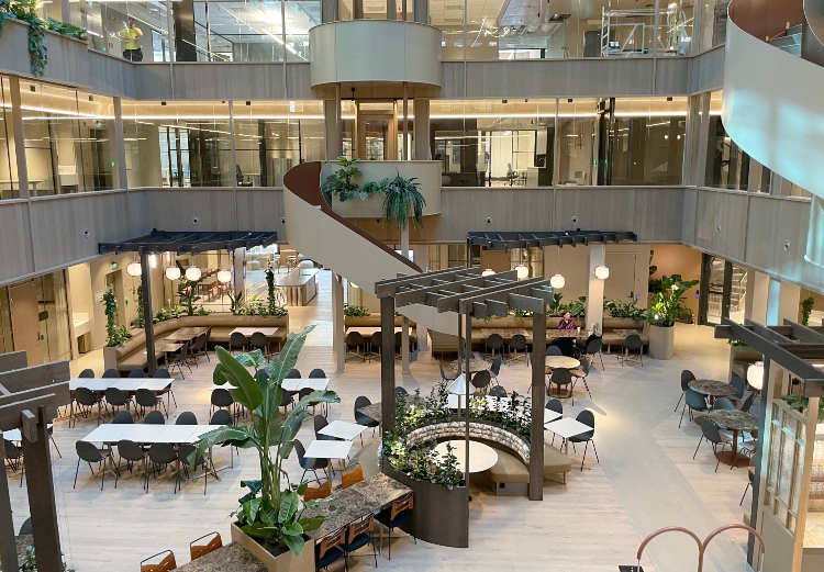 - Atriet og 1.ettasjen er nå langt mer åpen og tilgjengelig, og fremstår som hjertet i bygget, med personalrestaurant, cafe og møtte senter, hvor vi også designet alt fra spesialdesign av fast inventar til møblering, planter, gardiner og dekor.