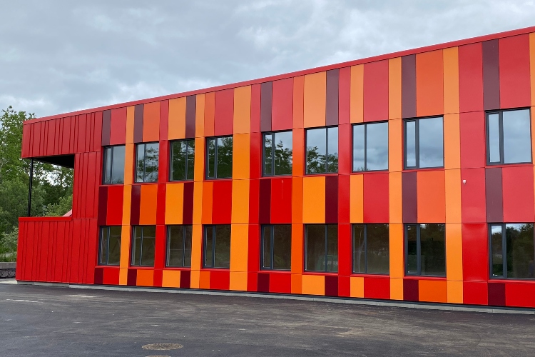 -Fargebruken har vært viktig i utforminga av skolen. Det nye skolebygget framstår eksteriørmessig i hovedsak i røde, varme toner. Fasaden er kledd med rød falset metallkledning i ulike bredder. Sørveggen mot skolegården har metallkledning i varierte varme farger i oransje til rødtoner.