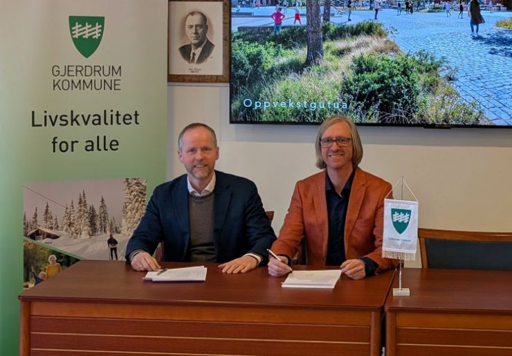 Pål Aglen, konserndirektør for byggvirksomheten i Skanska og Daniel Berg-Hansen, kommunedirektør i Gjerdrum kommune er svært fornøyde med vedtatt byggestart. Foto: Gjerdrum kommune