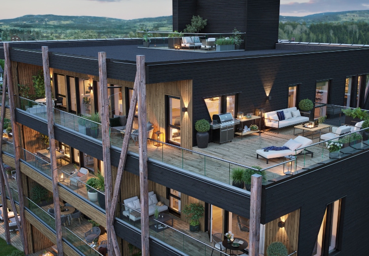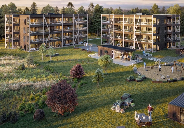Trehusene er et unikt og kostnadseffektivt leilighetskonsept oppført i det eneste fornybare byggematerialet, tre. Trehusene har kort byggetid og en konstruksjon som gir stor fleksibilitet slik at leilighetene i blokken kan skreddersys etter behov. ILL: BoligPartner/Allier Gruppen
