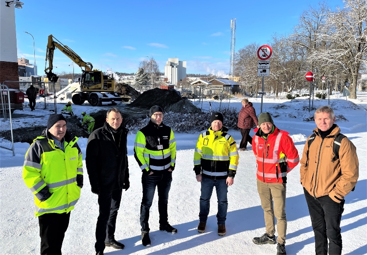 F.v.: Rune Venås fra Trøndelag fylkeskommune, Dag Haugdahl fra Bane NOR Eiendom, Morten Hynne og Ståle Gresdal fra Grande, Torgeir Wiig fra Veidekke og Arne Hognestad fra Bane NOR Eiendom. Foto: Trønder-Avisa