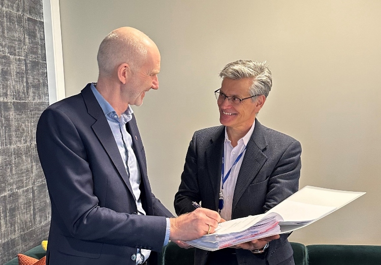 Veidekke signerte kontrakt med Bane NOR Eiendom om å bygge rådhuset. T.v. konserndirektør i Veidekke, Hans Olav Sørlie, og t.h. administrerende direktør i Bane NOR Eiendom, Jon-Erik Lunøe. Foto: Bane NOR Eiendom